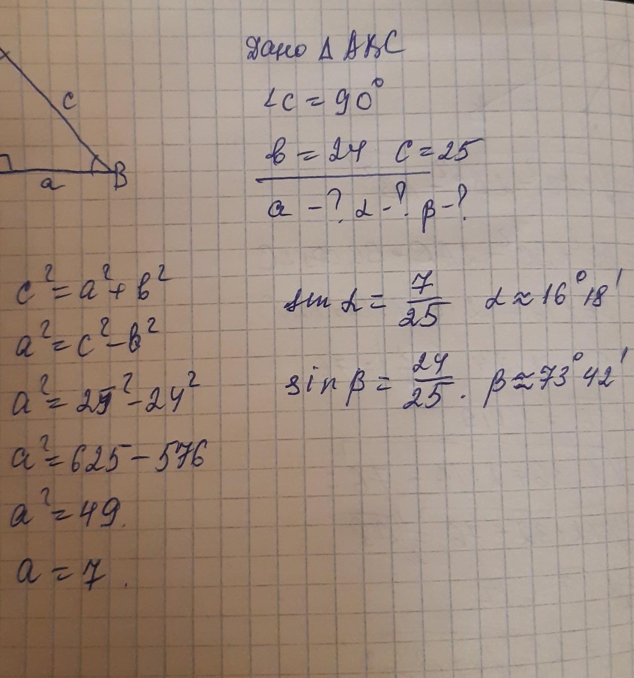 В прямоугольном треугольнике ABC угол C=90°, гипотенуза c=25 см, катет b=24 см, найдите катет a, углы альфа и бета