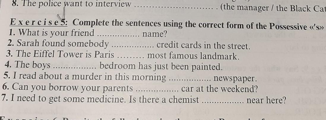 условие: complete the sentence using the correct form of the Possessive 《's》 or 《 ' 》