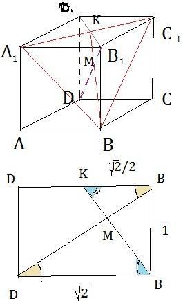 Треугольники КВ1М и DBM подобны по двум углам. (см. рисунок) D1B1=DB=√2 KB1=√2/2 По теореме Пифагора B1D=√3 KB=√(3/2) KM:MB=1:2 KM:((√3/2)–KB)=1:2 KB=√6/6 B1M:MD=1:2 B1M:(√3– B1M)=1:2 B1M=√3/3