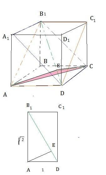 Чтобы построить линейный угол двугранного угла проводим к прямой B1D перпендикуляры AE и EC. AE=EC– высоты прямоугольных треугольников с катетами 1 и √2 и гипотенузой √3 АЕ=ЕС=1•√2/√3=√(2/3)