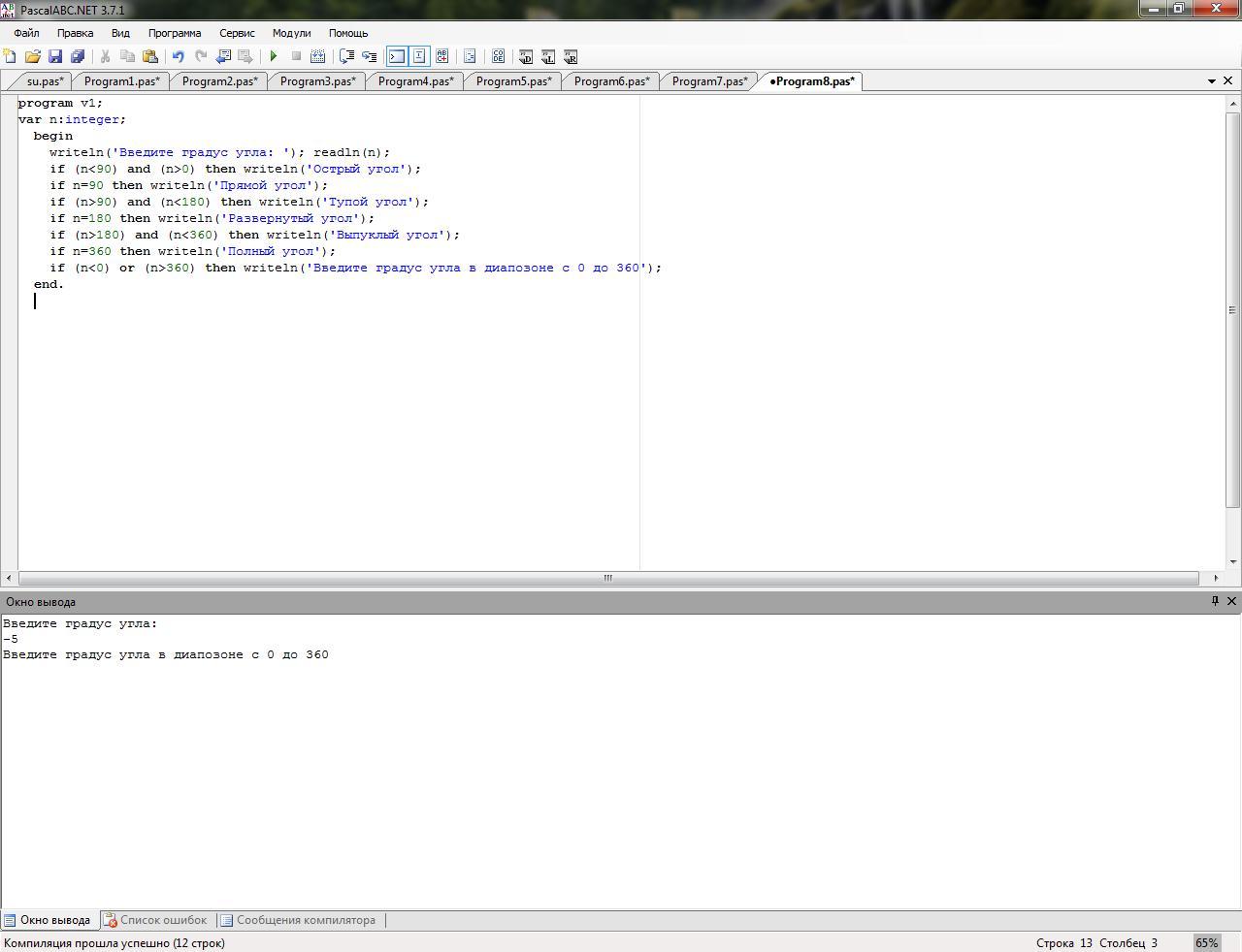 if (n<0) or (n>360) then writeln('Введите градус угла в диапозоне с 0 до 360');