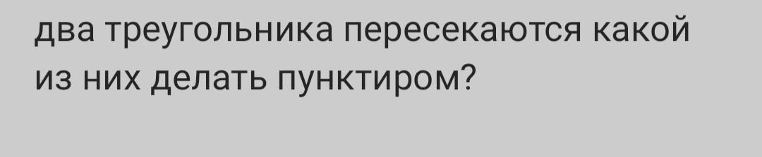 2) Используя любую точку пересечения сторон треугольников с одной стороны от линии пересечения на фронтальной проекции, определяете с помощью горизонтальной проекции , какая из этих двух точек к вам ближе. Сторона этого треугольника и будет видимой в выбранном пересечении на виде спереди. До линии пересечения треугольников этот треугольник будет проведён сплошной основной толстой линией, а второй треугольник 0- штриховой.