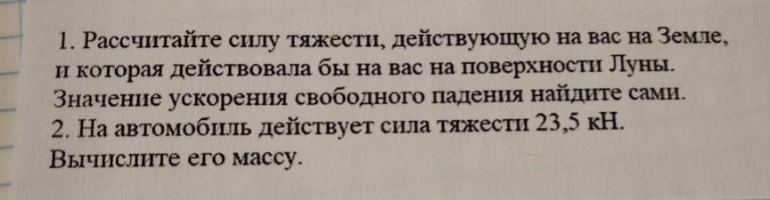 1Рассчитайте силу тяжести, действующую на вас на Земле, и которая действовала бы на вас на поверхности Луны. Значение ускорения свободного падения найдите сами. 2. На автомобиль действует сила тяжести 23,5 кН. Вычислите его массу.