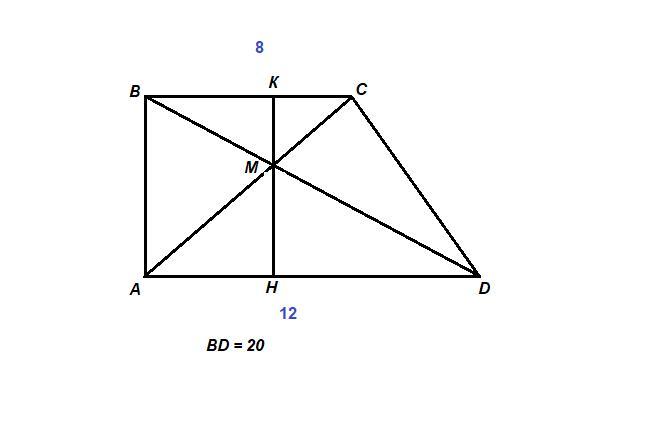 В прямоугольной трапеции ABCD (угол BAD=90 градусов) основаниями AD=12 и BC=8 большая диагональ BD=20. Диагонали AC и BD пересекаются в точке M.