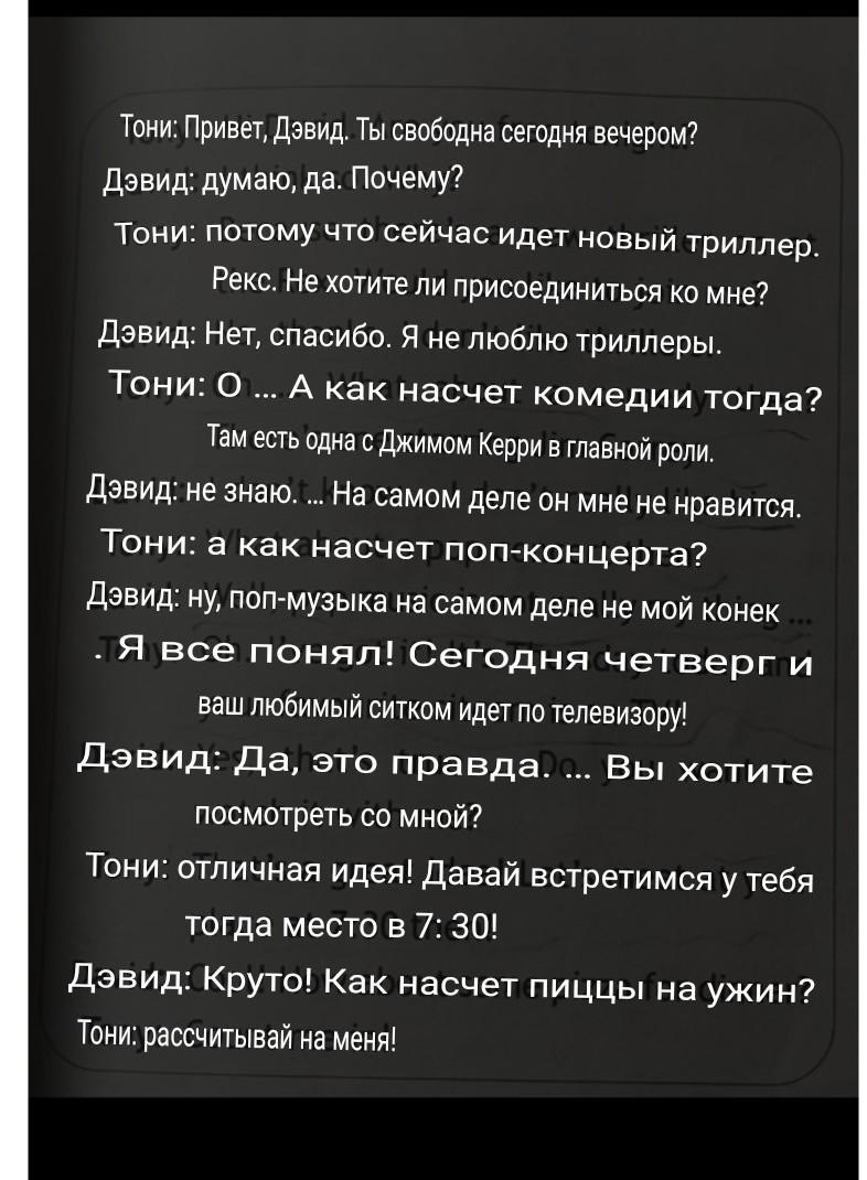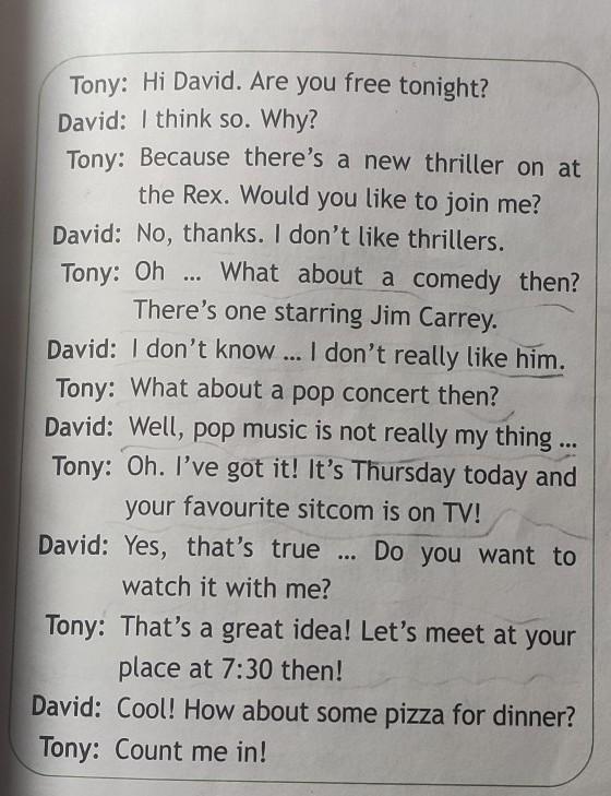 Тони: Потому что в «Рексе» идет новый триллер. Не хочешь присоединиться ко мне? Дэвид: Нет, спасибо. Не люблю триллеры.