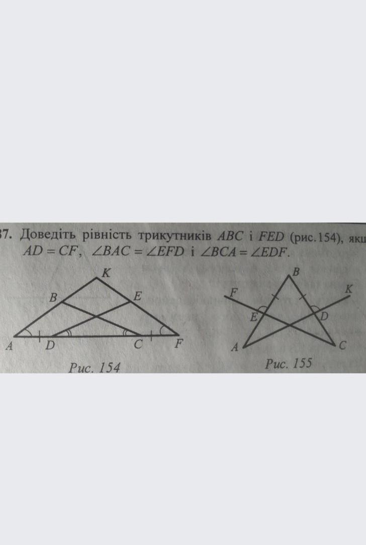 За другою ознакою трикутників а тобто "якщо сторона і два прилеглі до неї кути одного трикутника відповідно дорівнюють стороні і двом прилеглим до неї кутам другого трикутника, то такі трикутники - рівні" ми можем довести що ці трикутники рівні