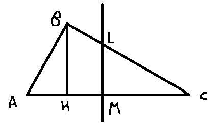 BH ll LM, т.к. оба перпендикулярны основанию AC. По теореме о пропорциональных отрезках (Параллельные прямые, пересекающие стороны угла, отсекают от его сторон пропорциональные отрезки) делаем вывод, что эти два параллельных отрезка отсекают на боковой стороны отрезки BL:LC=2:5.