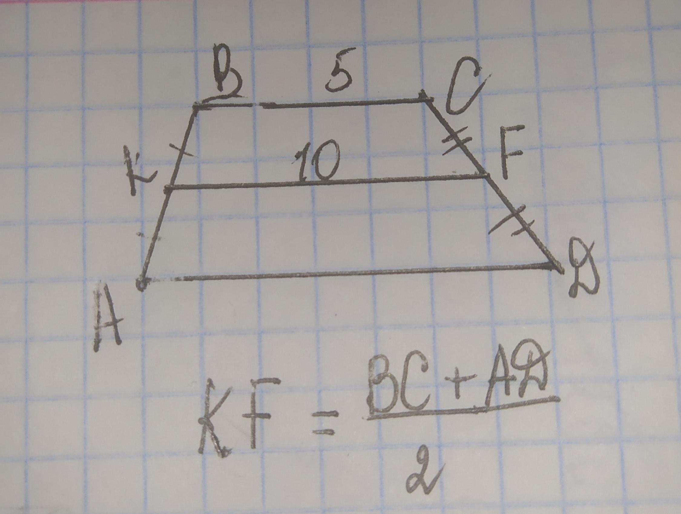Середня лінія трапециї дорівнює 10 см. Знайдіть одну з основ трапециї, якщо друга основа становиться 5 см.
