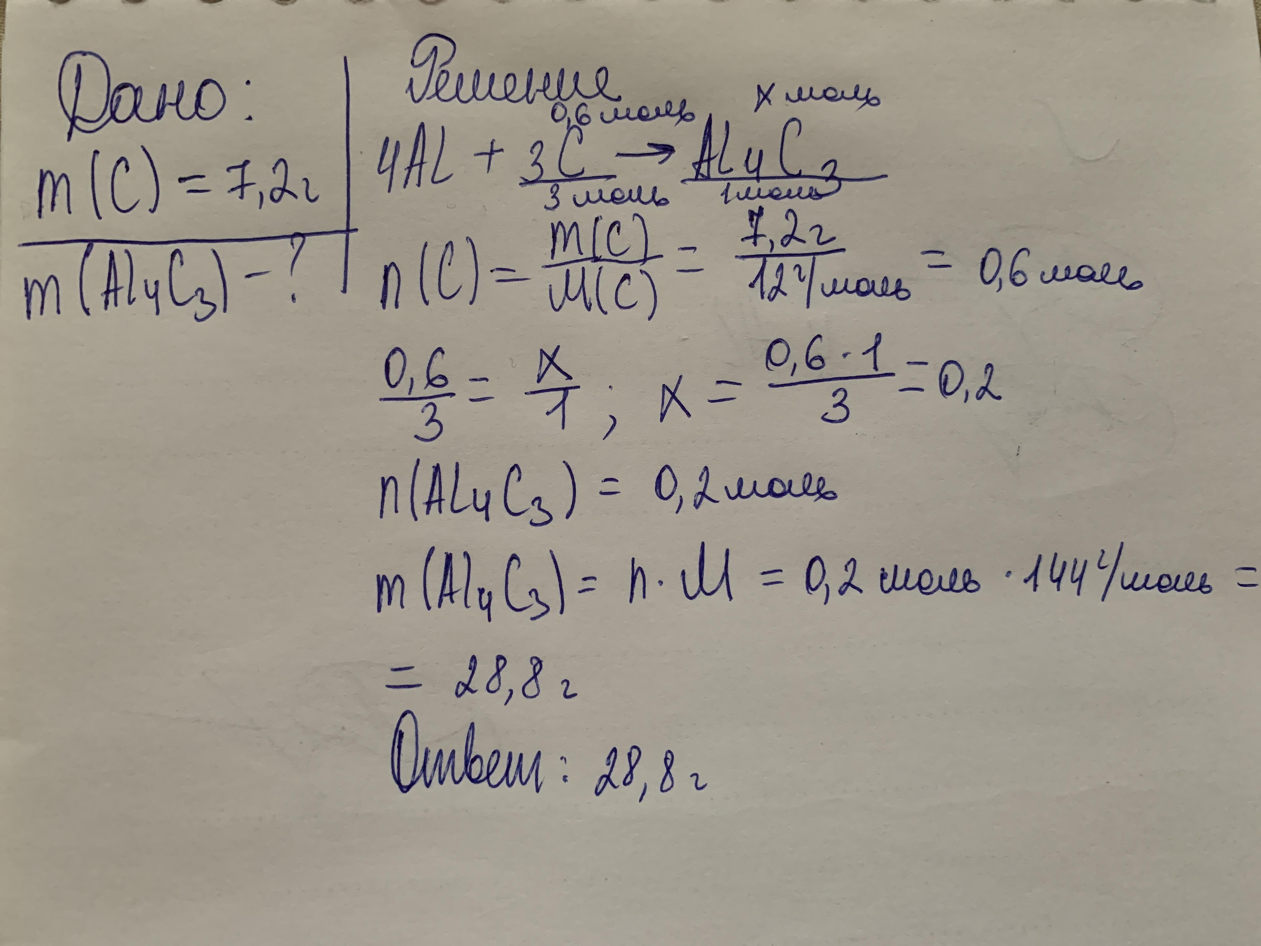 Вычисли, какая масса карбида алюминия образуется, если с алюминием прореагируют 7,2 г углерода.