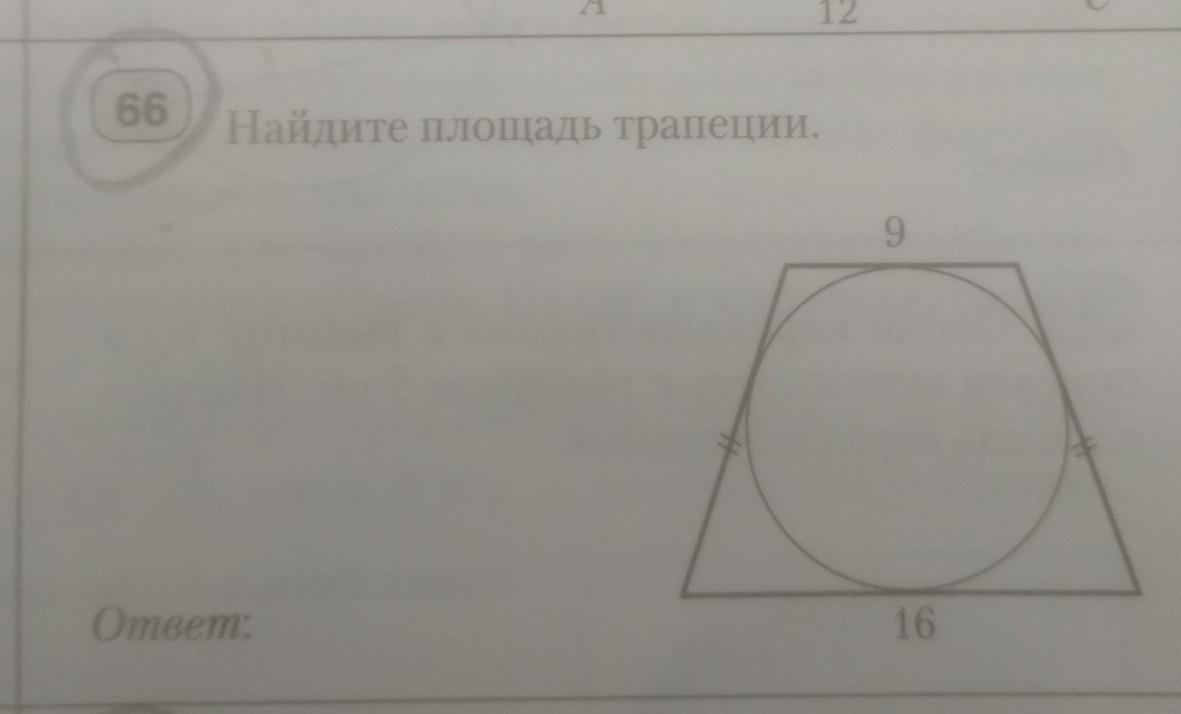 Т. к окружность вписана в 4-х угольник, то суммы длин противоположных сторон равны, т. е. 9+16=АВ+СД, тогда АВ=25/2. (т. к. трапеция равнобедренная).