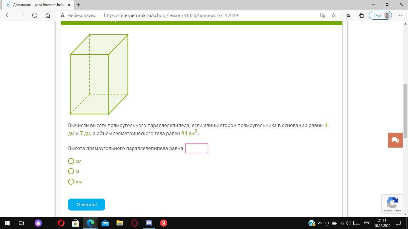 Пошаговое объяснение:V=a·b·h ⇒ h=84 : (4·7)=84:28=3 (дм)