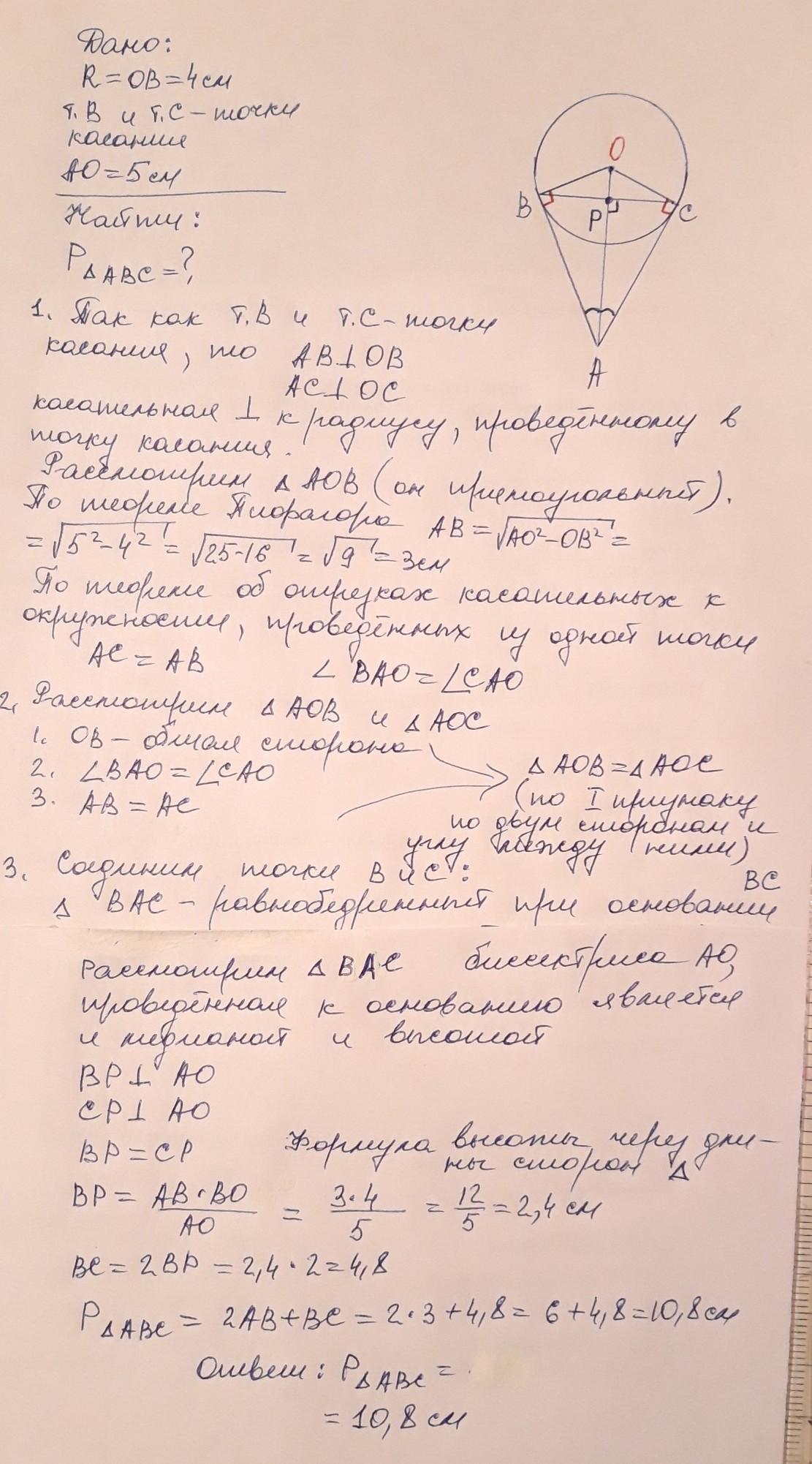 Из точки А к окружности радиуса 4см в точки касания В и С проведены две касательные. Найдите периметр треугольника АВС, если расстояние от точки А до центра окружности равно 5.