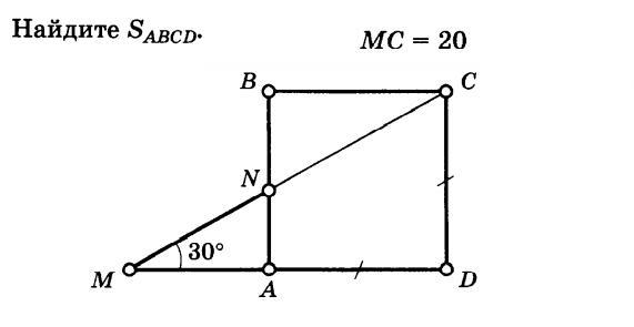 Так как треугольник MCD является прямоугольным, а угол М равен 30° то тогда выходит что катет CD=MC/2 CD=20/2=10. Так как AD=CD а угол D=90° то S(abcd)=10*10=100