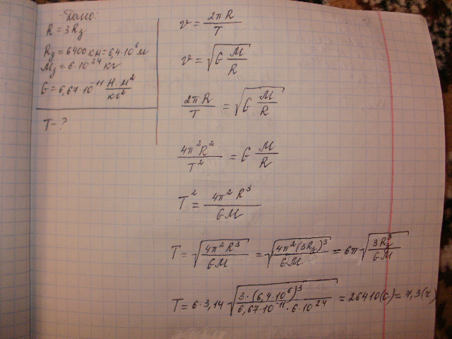 t=1/((Rз/R)*корень(g/R)/(2*pi)-1/T) =1/((1/3)*корень(9,81/6400000)/(2*pi)-1/(24*60*60)) сек = 18481,73 сек ~ 5ч 8 мин