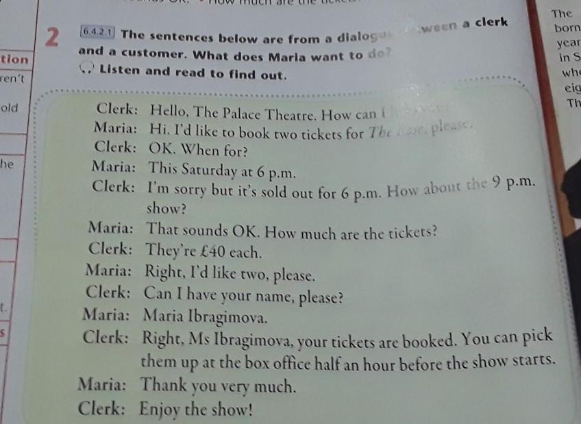 Maria: Hi. I'd like to book two tickets for The Rose, please.