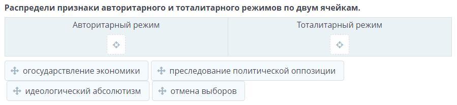 Распредели признаки авторитарного и тоталитарного режимов по двум ячейкам.