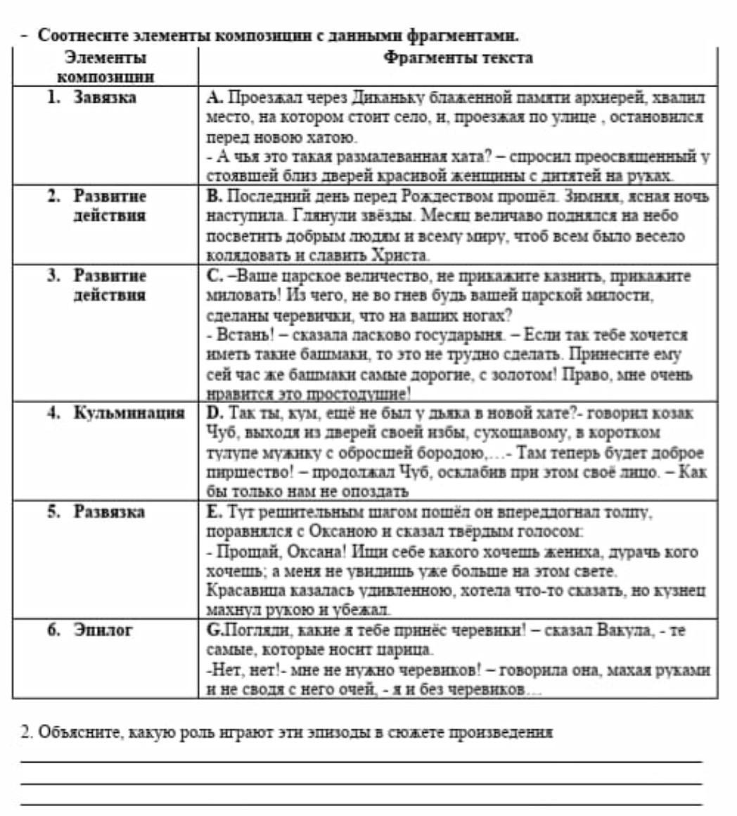 Соотнесите элементы композиции с данными фрагментами. Объясните, какую роль играют эти эпизоды в сюжете произведения. пж кратко. это произведение ночь перед рождеством.