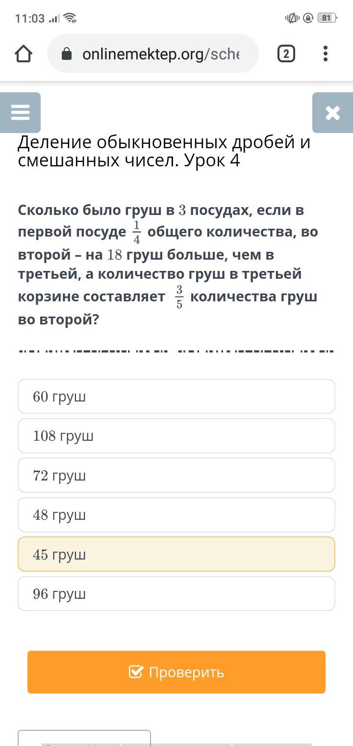 Сколько было груш в 3 посудах, если в первой посуде 1/4 общего количества во второй- на 18 груш больше чем в третий, а количесиво груш в третьей в корзине состовляет 3/5 количество груш во второй? 60 груш 108 груш 72 груш 48 груш 45 груш 96 груш