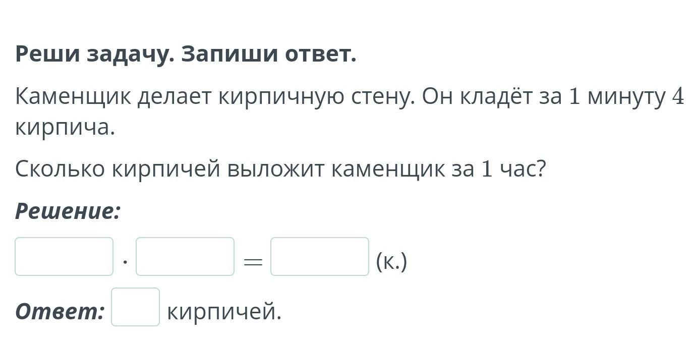 Минут в часе 60, а в минуту каменщик кладет за одну минуту 4 кирпича.