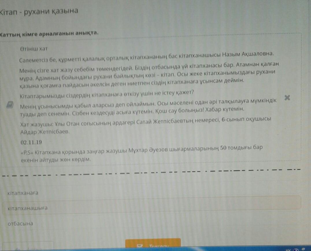 Кітап - рухани қазына Хаттың кімге арналғанын анықта .