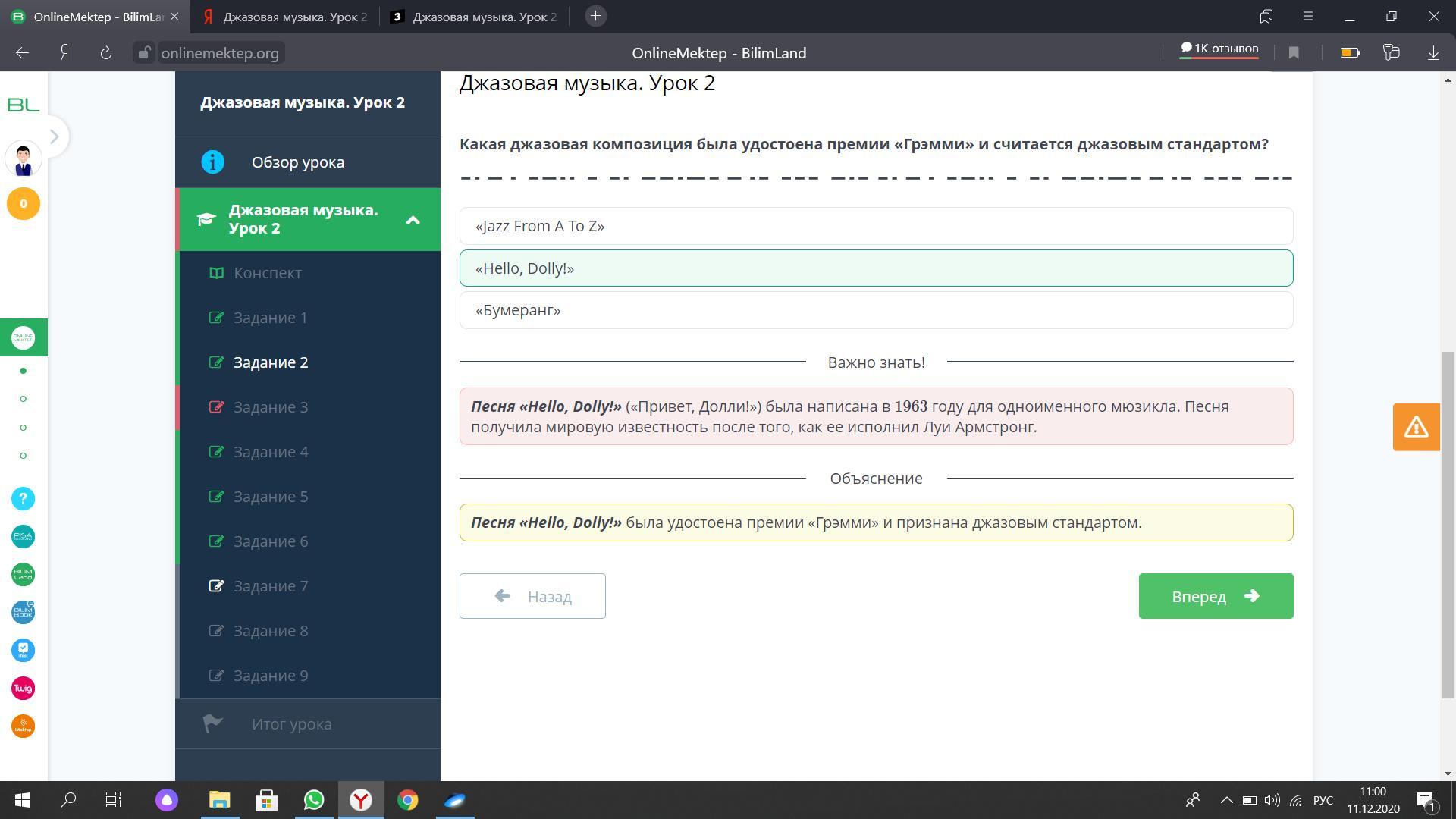 Джазовая музыка. Урок 2 Какая джазовая композиция была удостоена премии «Грэмми» и считается джазовым стандартом? «Hello, Dolly!» «Бумеранг» «Jazz From A Тo Z» пж быстрее кому не лень