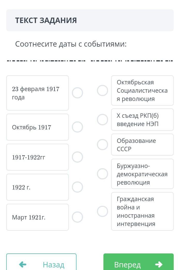 Ответ: 1917 октября - октябрьская революция. 1917 23 февраля буржуазно-дем. Революция 1917-1922 гражднаская война . 1921 март г. X Съезд РКП(Б) 1922 образование СССР