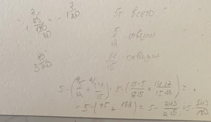 На складе было 5 тонны овощей. В детский садик отвезли 5 /12 тонны, а в школы 1 4/15 тонны. Сколько тонн овощей осталось на складе?