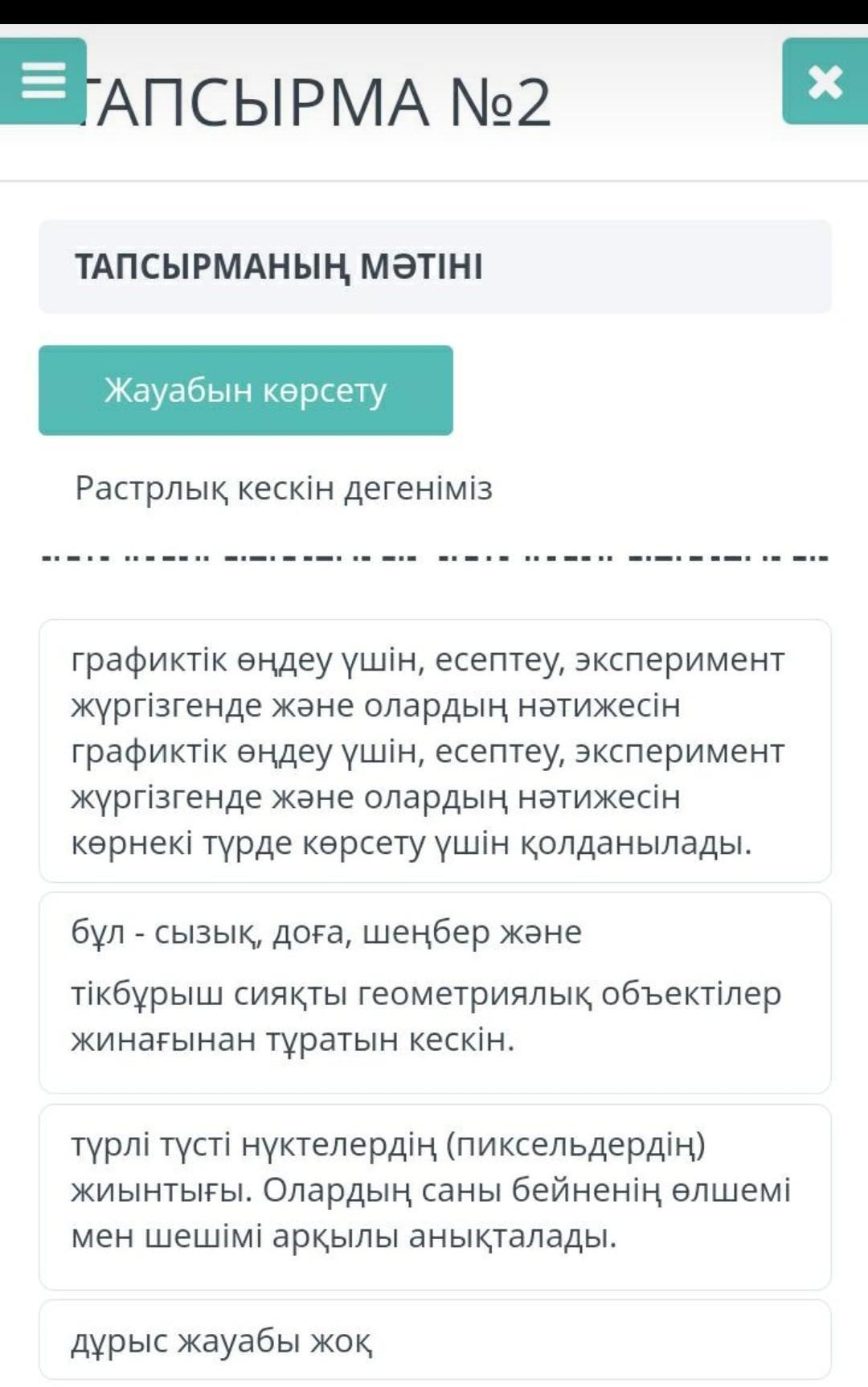 Растрлық кескін-түрлі түсті нүктелердің (пиксельдердің) жиынтығы. Олардың саны бейненің өлшемі мен шешімі арқылы анықталады.