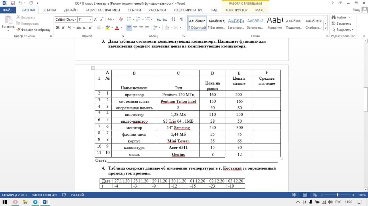 Дана таблица стоимости комплектующих компьютера. Напишите функцию для вычисления среднего значения цены на комплектующие компьютера.