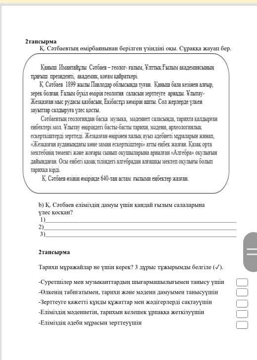b) 1) Қ.И.Сәтбаев негізгі ғылыми еңбегін Қазақстан кен орындарының геологиясын, минералдық қорларын жасауға арнаған.