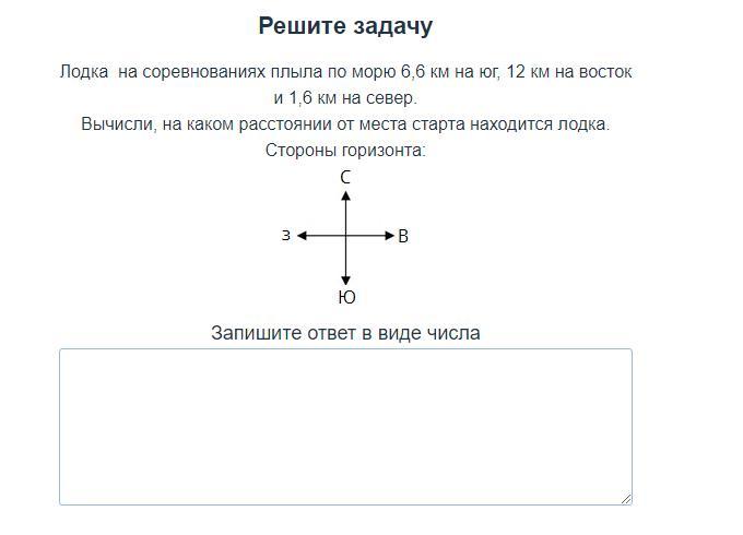 Лодка на соревнованиях плыла по морю 6,6 км на юг, 12 км на восток и 1,6 км на север.