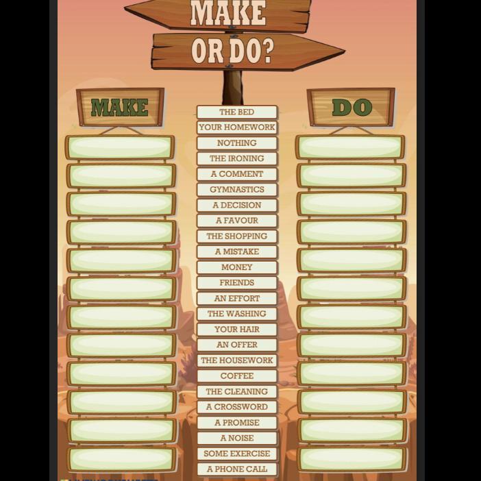 make:the bed,a comment,a decision,a favour,a mistake,money,friends,an effort,your hair,an offer,coffee,crossword,promise,noise,a phone call