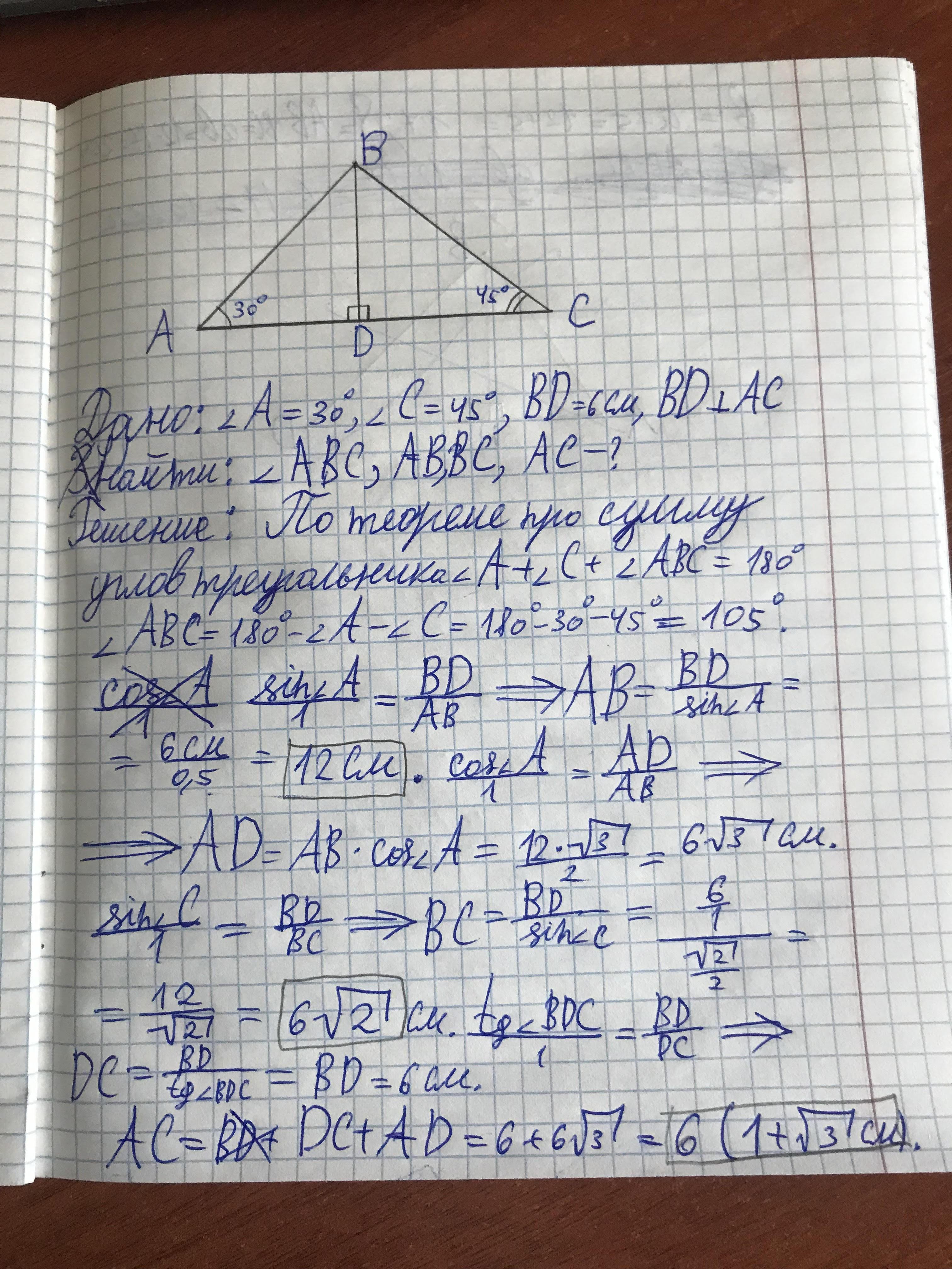 Известно, что треугольник АВС равен ∠А= 30° и ∠С= 45°. Если высота BD= 6 см,