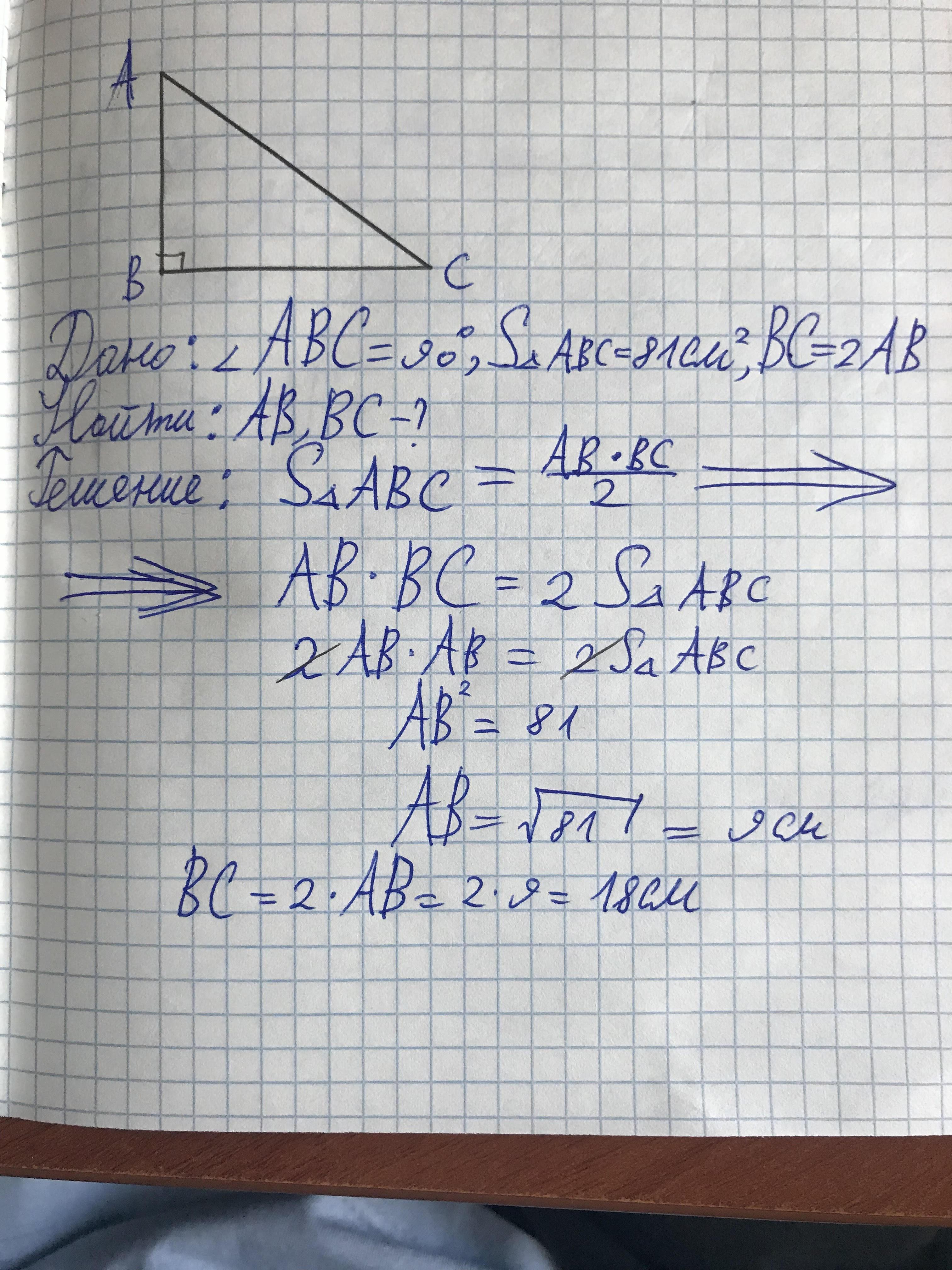 Площадь прямоугольного треугольника равна 81 см в квадрате. Найдите катеты , если известно , что один из катетов в 2 раза больше другого
