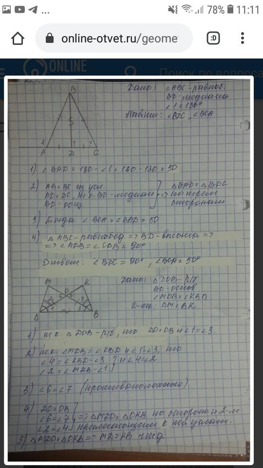 В равнобедренном треугольнике АВС с основанием АС проведена медиана BD. Найдите градусные меры углов ВDА и АBC, если внешний угол ВСК равен 1500.