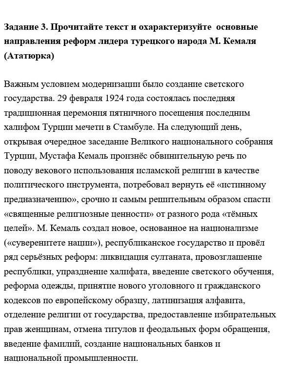 Задание 3. Прочитайте текст и охарактеризуйте основные направления реформ лидера турецкого народа М. Кемаля (Ататюрка)