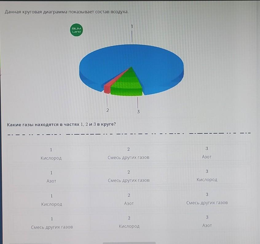Даная Круговая диаграмма показывает состав воздуха. Какие газы находятся в частях 1, 2 и 3 в круге?