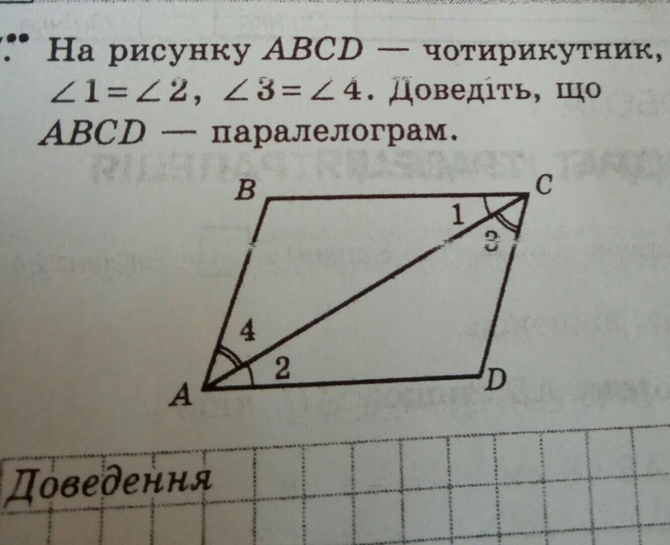угол 1 и угол 2 равны друг другу точно также как и угол 4 у углу 3.