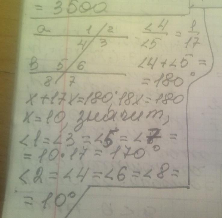 знайдіть кути при паралельних прямих та січній, якщо внутрішні односторонні кути відносяться як 1:17