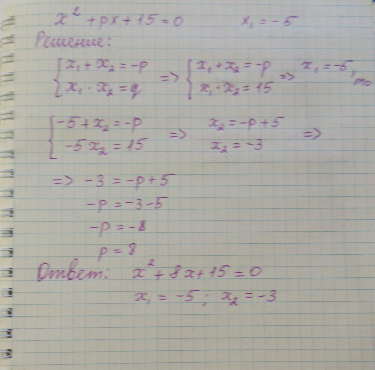 В уравнении х^2 +рх +15 =0 один из корней равен -5. Найдите второй корень и коэффициент р.