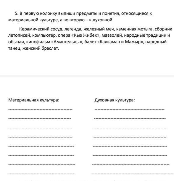 духовная культура: легенда.опера "Кыз Жибек".народный танец.балет "Калкаман и Мамыр".кинофильм "Амангельды". народные традиции и обычаи.мавзолей