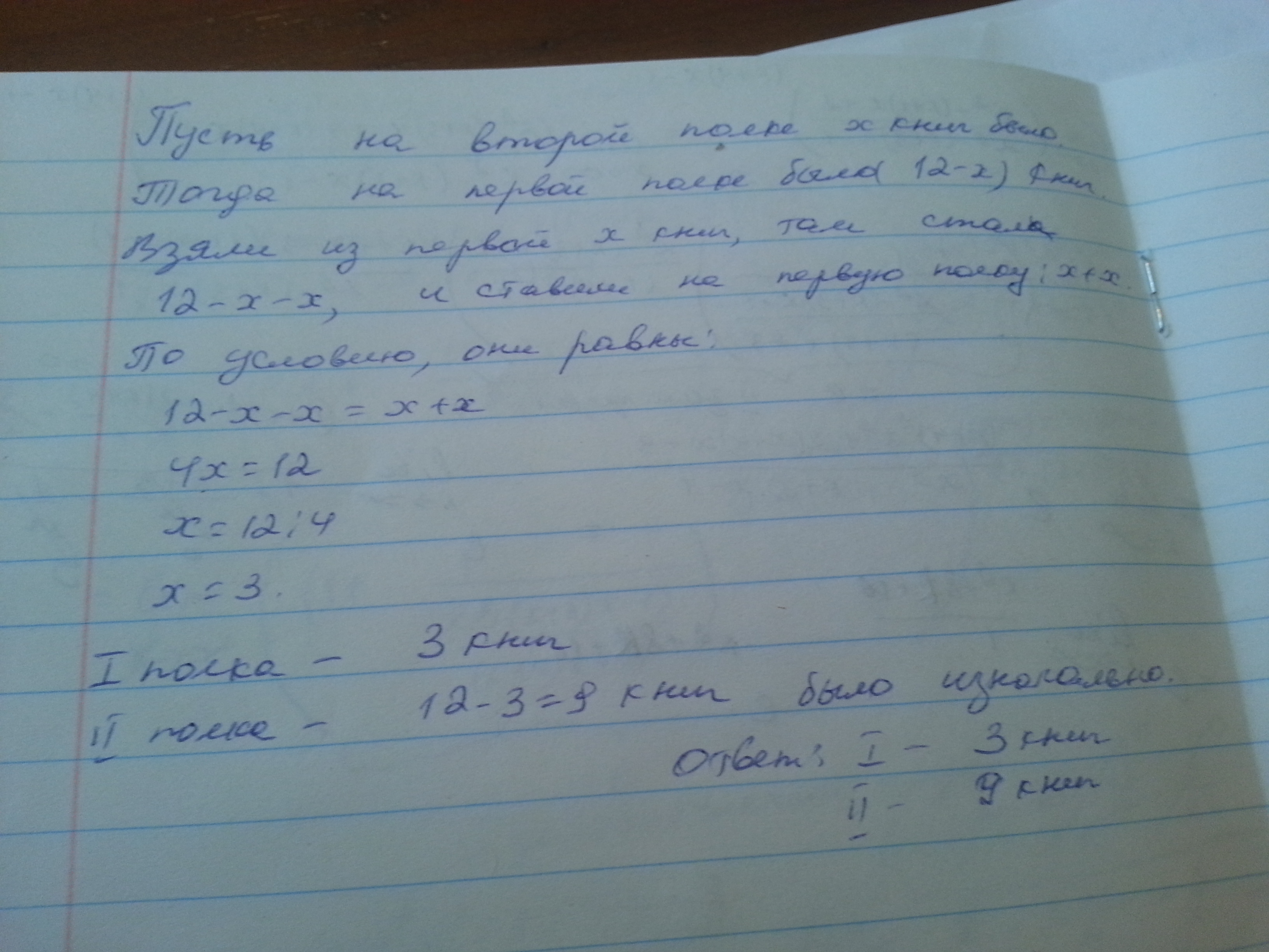 На двух полках стояло 12 книг.Когда с первой полки на вторую переставили столько книг,сколько до этого стояло на второй полке ,то книг на полках стало поровну.Определите ,сколько книг первоначально стояло на каждой полке.