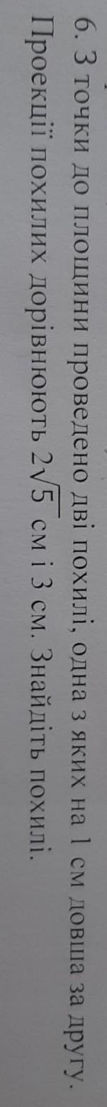 6. 3 точки в плоскости проведсно две наклонные, одна из которых на 1 см ловша другой. Проекции наклонных дорившоють 2V5 см и 3 см. Найдите наклонные.