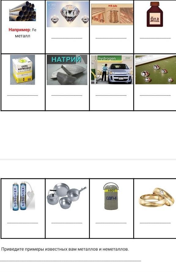 Подпишите под каждым рисунком символ химического элемента и его принадлежность металлом или неметаллом как указано на примере