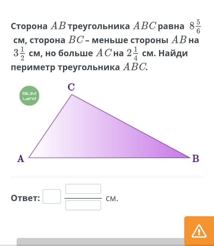 Сторона А В треугольника АВС равна 8 5/9 см, но больше АС на 2 1/4 см. Найди периметр треугольника АВС