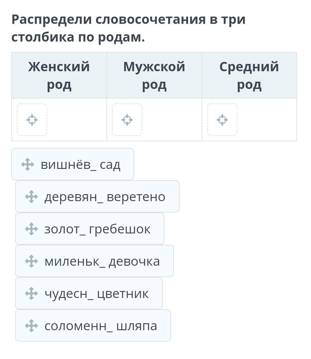 вишневый сад-мужской род золотой гребешок м.р миленькая девочка-ж.р чудесный цветник-м.р соломенная шляпа-м.р деревяное веретено -с.р