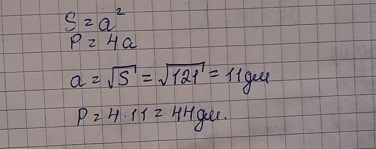 Найди периметр квадрата, площадь которого 121 дм^2.
