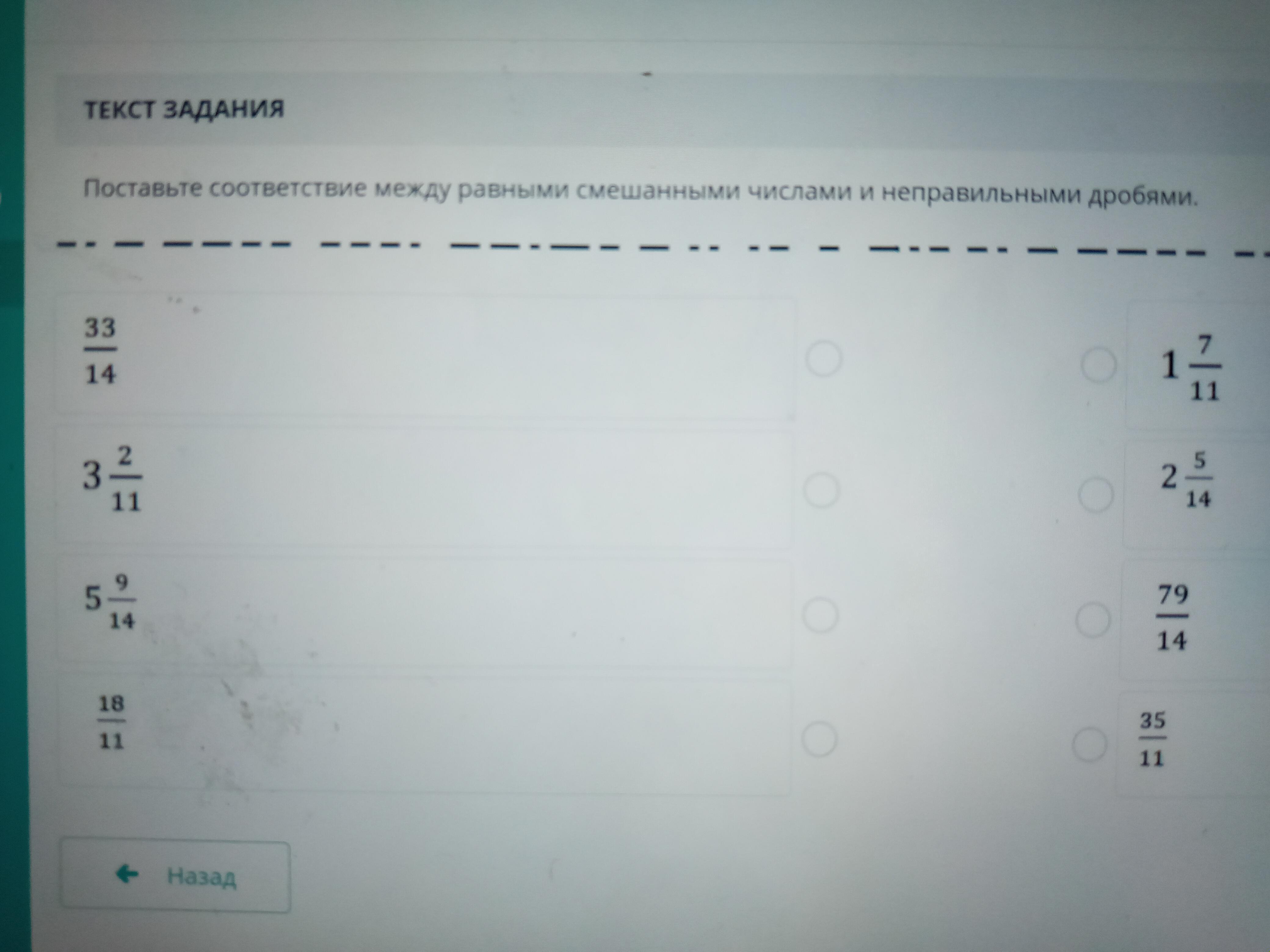 Поставьте соответствие между равными смешанными числами и неправильными дробям