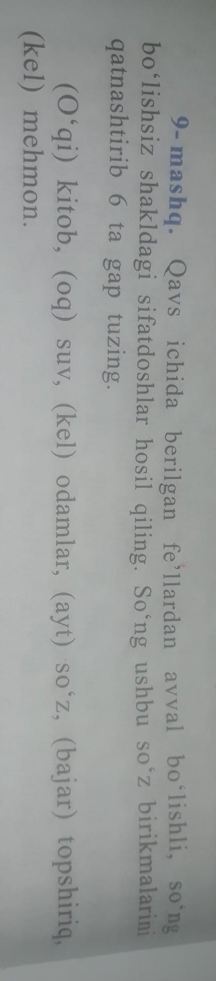 9- mashq. Qavs ichida berilgan fe'llardan avval bo'lishli