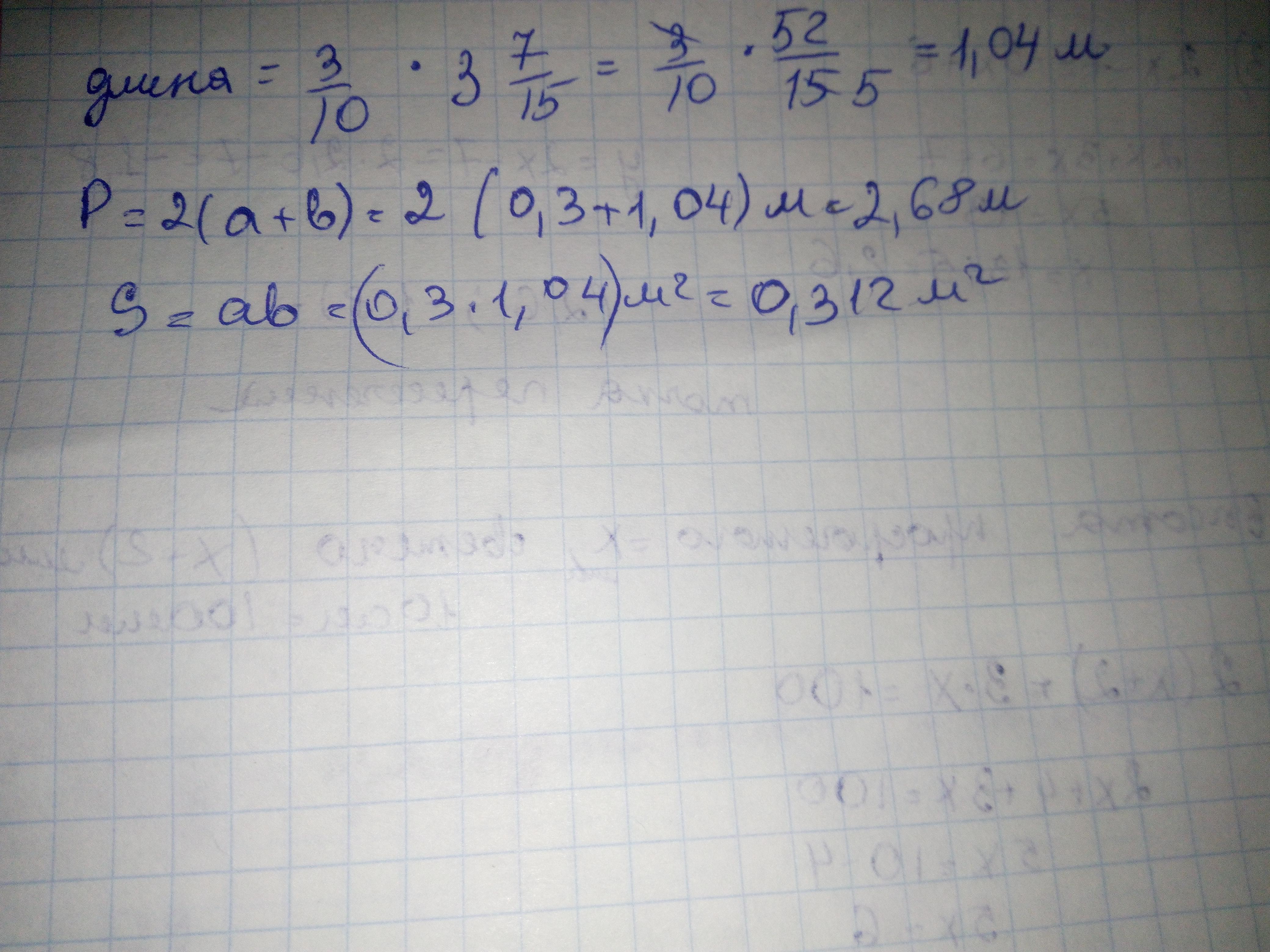 Задание 5. Найди периметр п площадь прямоугольника, если известно, что его ширина равна 3/10 м, а длина в 3 7/15 раз больше. Помогите у меня СОР